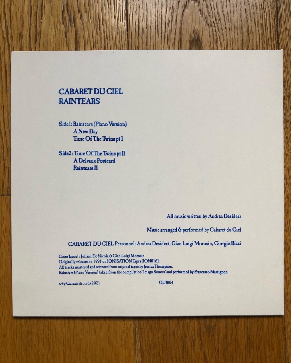 Quindi Records returns once more to the swooning romanticism of Cabaret du Ciel, the long-running project from Andrea Desidera and Gian Luigi Morosin. After the contemporary material which made up long-player The Breath Of Infinity, Raintears heads back into the group’s archives and focuses on a limited cassette release from 1991.