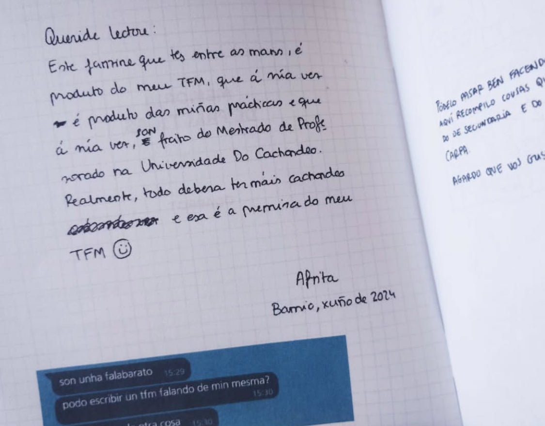 "Este fanzine que tes entre as mans é produto do meu TFM, que á súa vez é produto das miñas prácticas e que á súa vez, son froito do Mestrado de Profesorado na Universidade Do Cachondeo. Realmente, todo debería ter máis cachondeo e esa é a premisa do meu TFM :)"