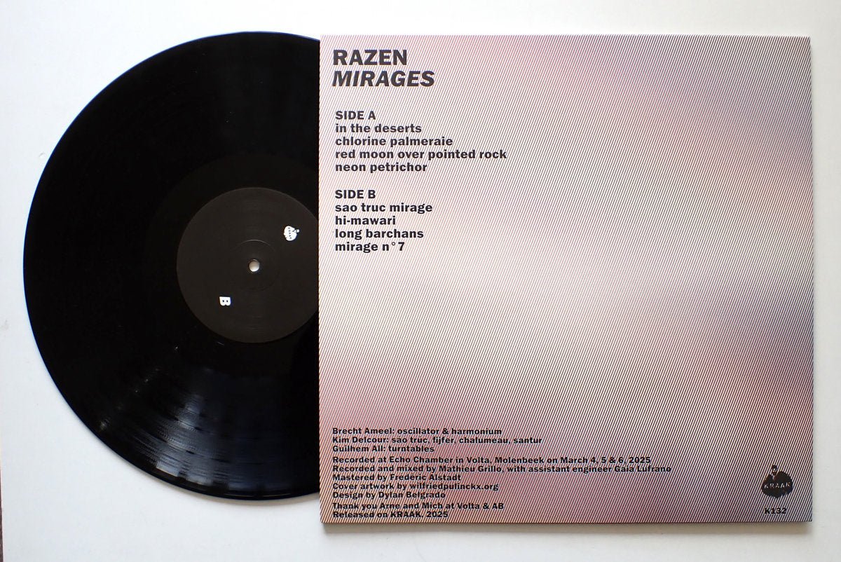 The magic lantern music of Razen spirals into ever more fanatic territory as its iconoclastic core, Brecht Ameel and Kim Delcour, incorporate turntablist Guilhem All from Brest into the fold for their latest work, Mirages. Like a refracted prism of misdirected inputs, the sounds that emanate from the first seconds to the last are uncanny, unpredictable and unplaceable within the realm of their cinematic oddness. Vietnamese flute, oscillator, chopped-up vinyls and a range of uncomfortable techniques bring about a series of sandblown, rock-encrusted desert mirages which reveal themselves from the stillness and spin frenetically into the unknown.