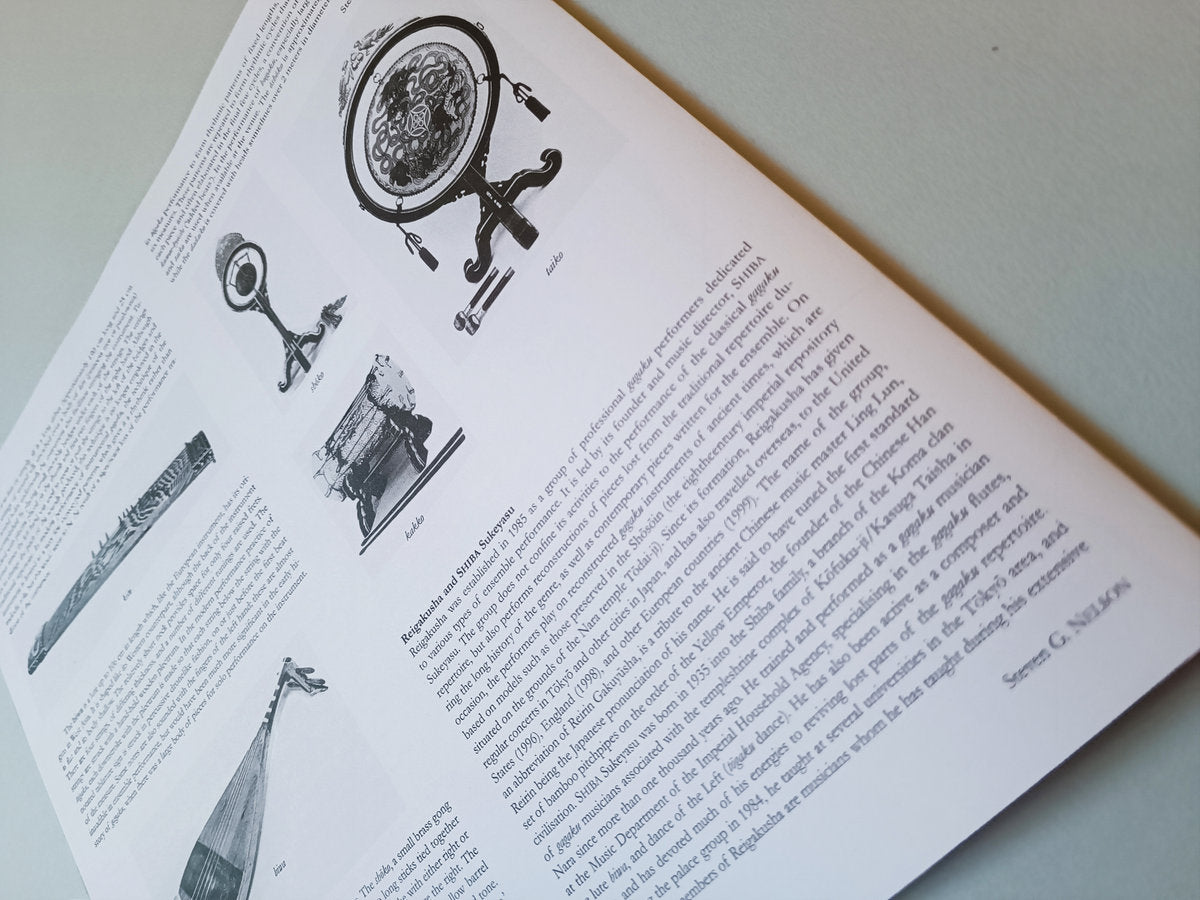 Gagaku is the oldest of the Japanese performing arts, with a history more than a thousand years old. The term refers to Japanese classical music and dance, traditionally performed by families of musicians linked to the ancient Imperial court, and later passed down in Buddhist temple ceremonies and Shinto shrines. Shiba Sukeyasu, founder and director of the Reigakusha ensemble, descends from the Koma clan, whose origins date back to the end of the 10th century. The recordings partly reflect repertoires borrowed from Chinese music between the 5th and 9th centuries. The incredible variety of timbres of the instruments greatly amplifies our exotic imagination: the eternal breath of the flutes (ryuteki and hichiriki) creates a sort of suspension of time, together with the hypnotic and hallucinatory atmosphere of the mouth organs (shō). The meditative tone of the string instruments (bika and koto) that punctuate the voids and silences is impressive, as is the enigmatic percussion section, with the tolling of the gong (shōko) and the calibrated beats of the drums (taiko and kakko).
