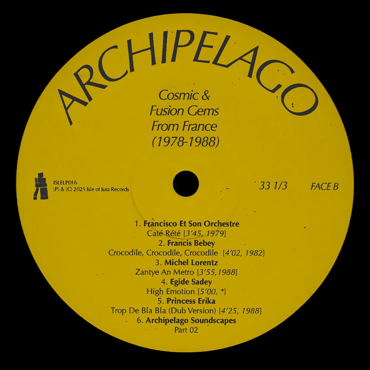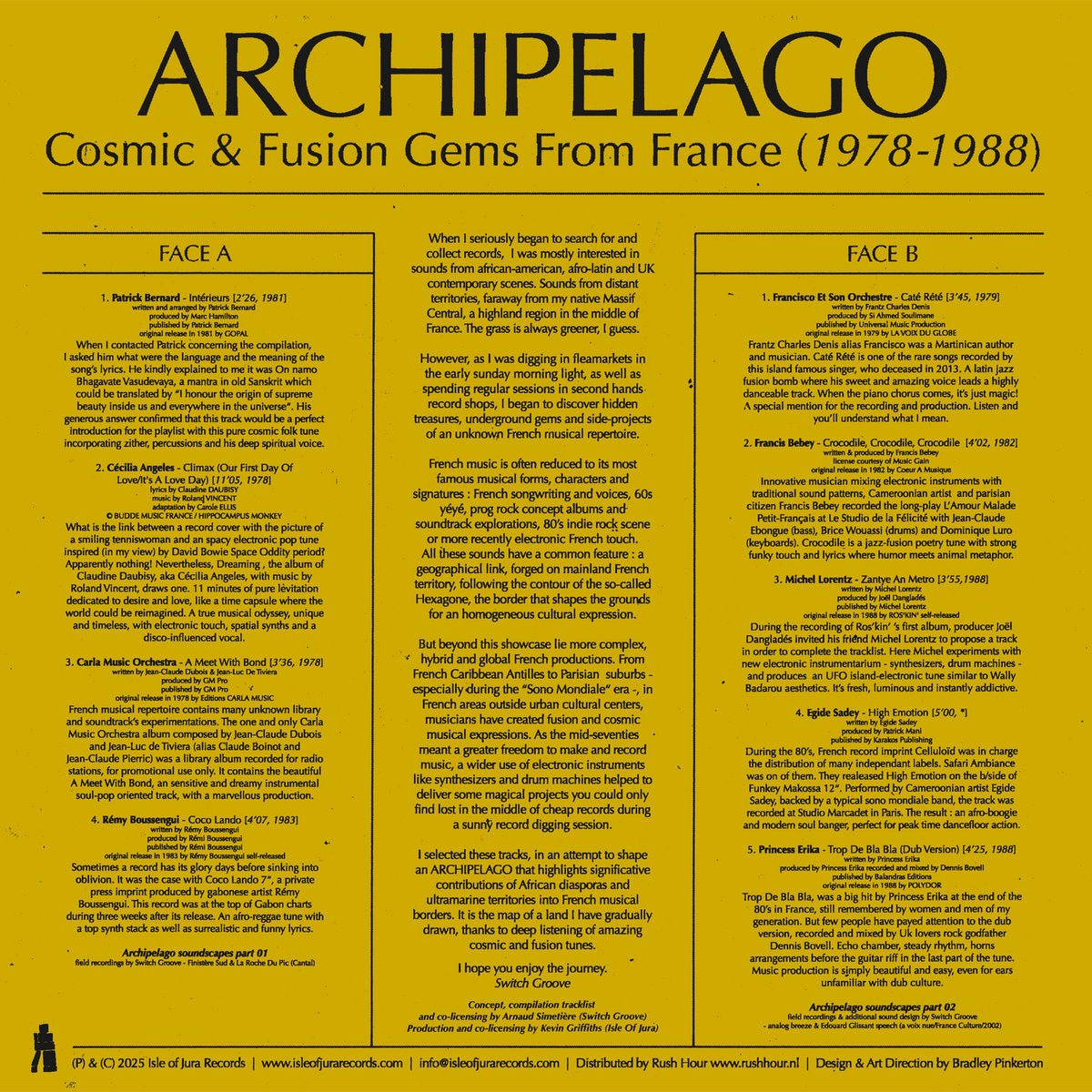 French music is often reduced to its most famous musical forms, characters and signatures : French songwriting and voices, 60s yéyé, prog rock concept albums and soundtrack explorations, 80’s indie rock scene or more recently electronic French touch. All these sounds have a common feature : a geographical link, forged on mainland French territory, following the contour of the so-called Hexagone, the border that shapes the grounds for an homogeneous cultural expression. But beyond this showcase lie more complex, hybrid and global French productions. From French Caribbean Antilles to Parisian suburbs - especially during the ‘Sono Mondiale’ era -, in French areas outside urban cultural centers, musicians have created fusion and cosmic musical expressions. As the mid-seventies meant a greater freedom to make and record music, a wider use of electronic instruments like synthesizers and drum machines helped to deliver some magical projects you could only find lost in the middle of cheap records during a sunny record digging session. I selected these tracks, in an attempt to shape an ARCHIPELAGO that highlights significative contributions of African diasporas and ultramarine territories into French musical borders. It is the map of a land I have gradually drawn, thanks to deep listening of amazing cosmic and fusion tunes. I hope you enjoy the journey.”