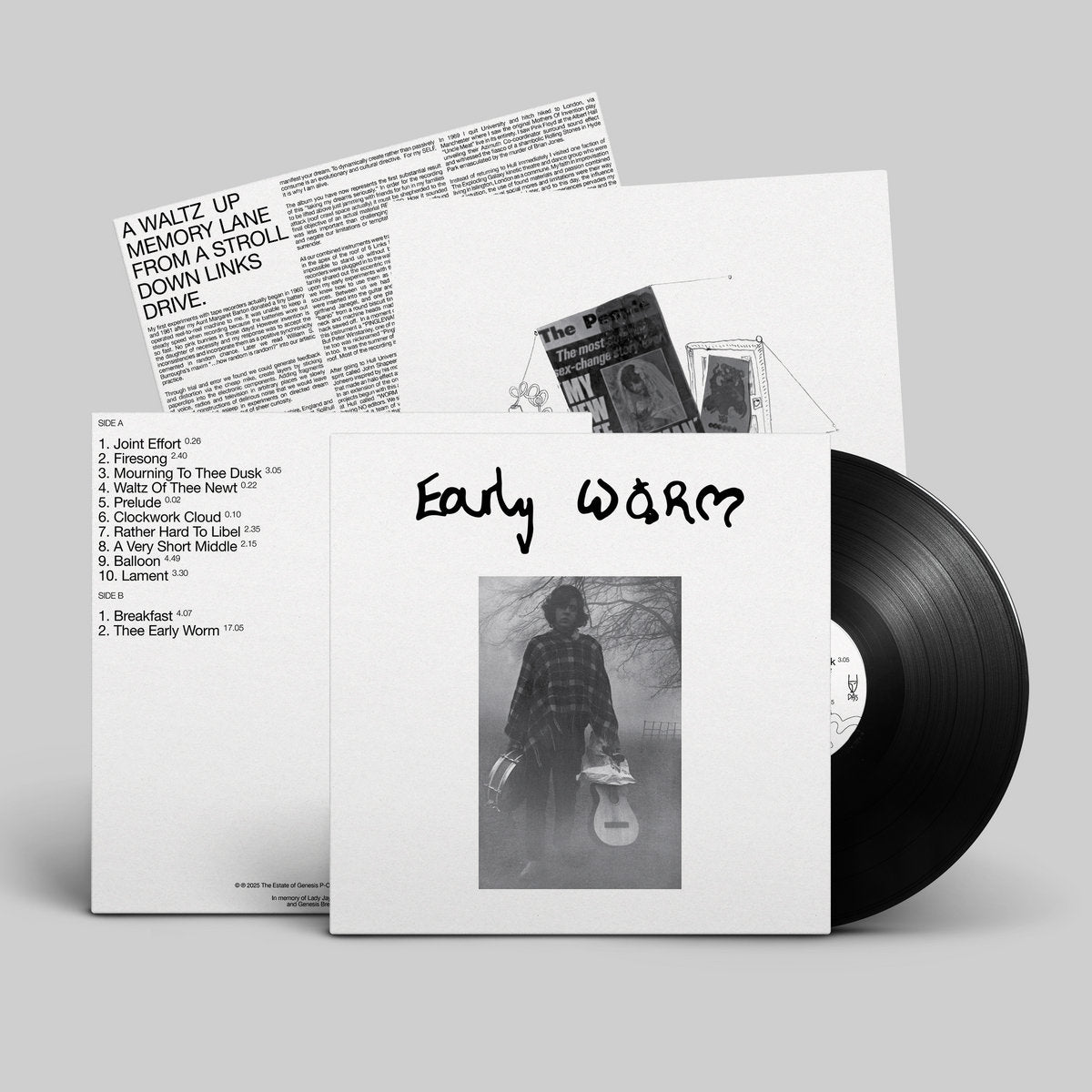 (then Neil Andrew Megson) gathered with friends in a modest attic space to experiment with sound. The result was Early Worm, a collection of recordings that capture the nascent creativity of an artist who would later become a pivotal figure in avant-garde music. These sessions, pressed to a single acetate in 1969, showcase a fearless exploration of noise, improvisation, and tape experiments, reflecting influences from psychedelia, Fluxus, John Cage, and beatnik Bohemia. Early Worm stands as a testament to P-Orridge's early commitment to pushing musical boundaries. The album's raw and unfiltered soundscapes offer listeners a rare glimpse into the foundational moments that would eventually lead to the formation of COUM Transmissions, Throbbing Gristle, and Psychic TV.