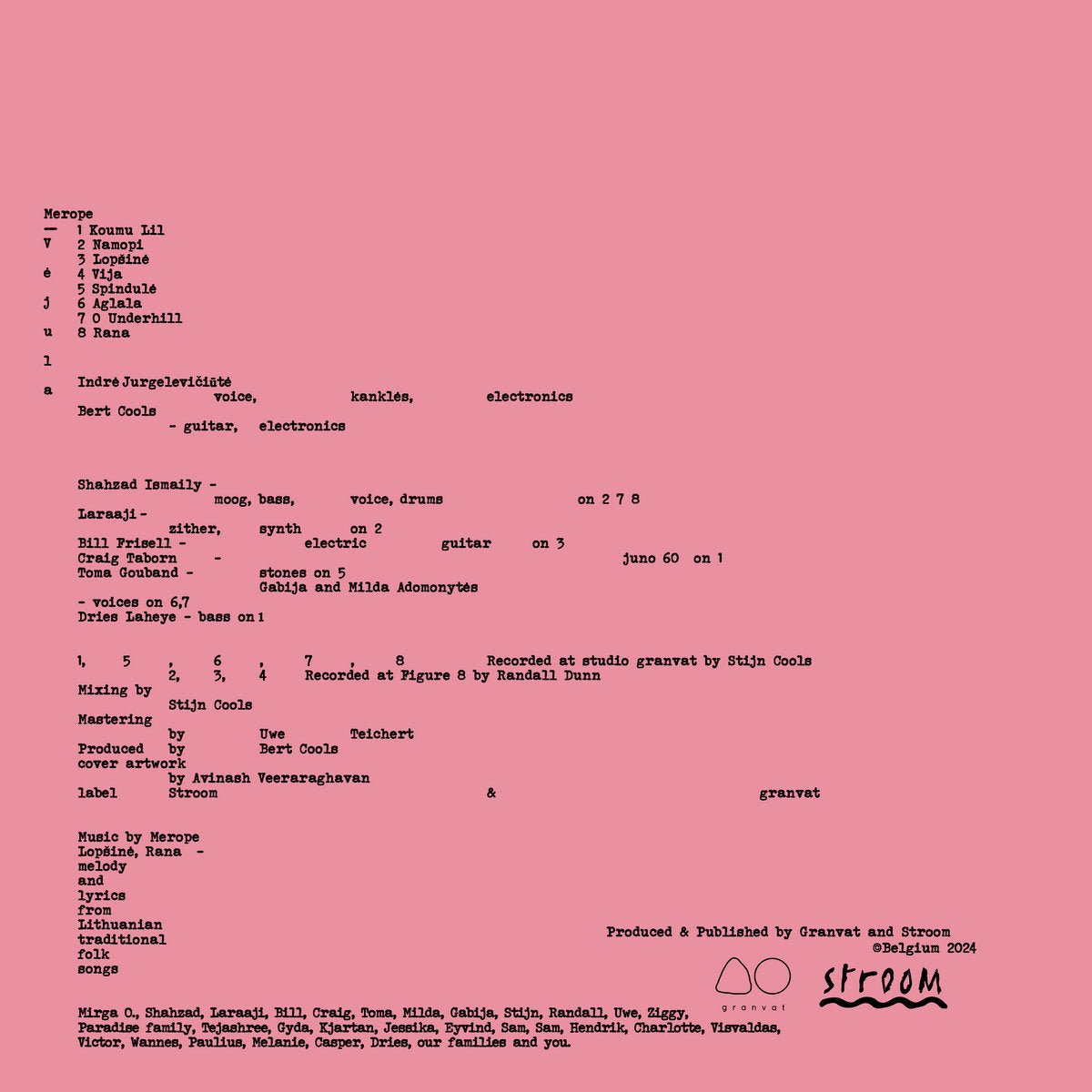 Merope's most experimental full length to date, Vėjula is a celebration of collaboration and playfulness, and features appearances from Shahzad Ismaily, Laraaji and Bill Frisell. Like its predecessors, the duo's fifth album still roots itself in Lithuanian folk forms, but sprouts out spiritedly from that point into unfamiliar landscapes, muddling ancient themes with contemporary philosophies, concepts and technology. Delicate instrumental sequences and ethereal vocals are woven into a rich tapestry of subtle synth work and evocative field recordings. On 'Kouma Lil', Indrė Jurgelevičiūtė and Bert Cools experiment with digital images of the kanklės (a traditional Lithuanian chordophone), and Jurgelevičiūtė's voice, blurring the boundary between the organic and the artificial, while on 'Spindulė, French percussionist Toma Gouband adds percussion from his custom-made sounding stones to Jurgelevičiūtė's gentle words and Cools' surreal, sensuous electronics. 'Vėjula' is an album that reaches into the unknown without loosing its tight grip on the past. Merope are in a new creative phase of their career, and they've never sounded quite so universal, or so vital.
