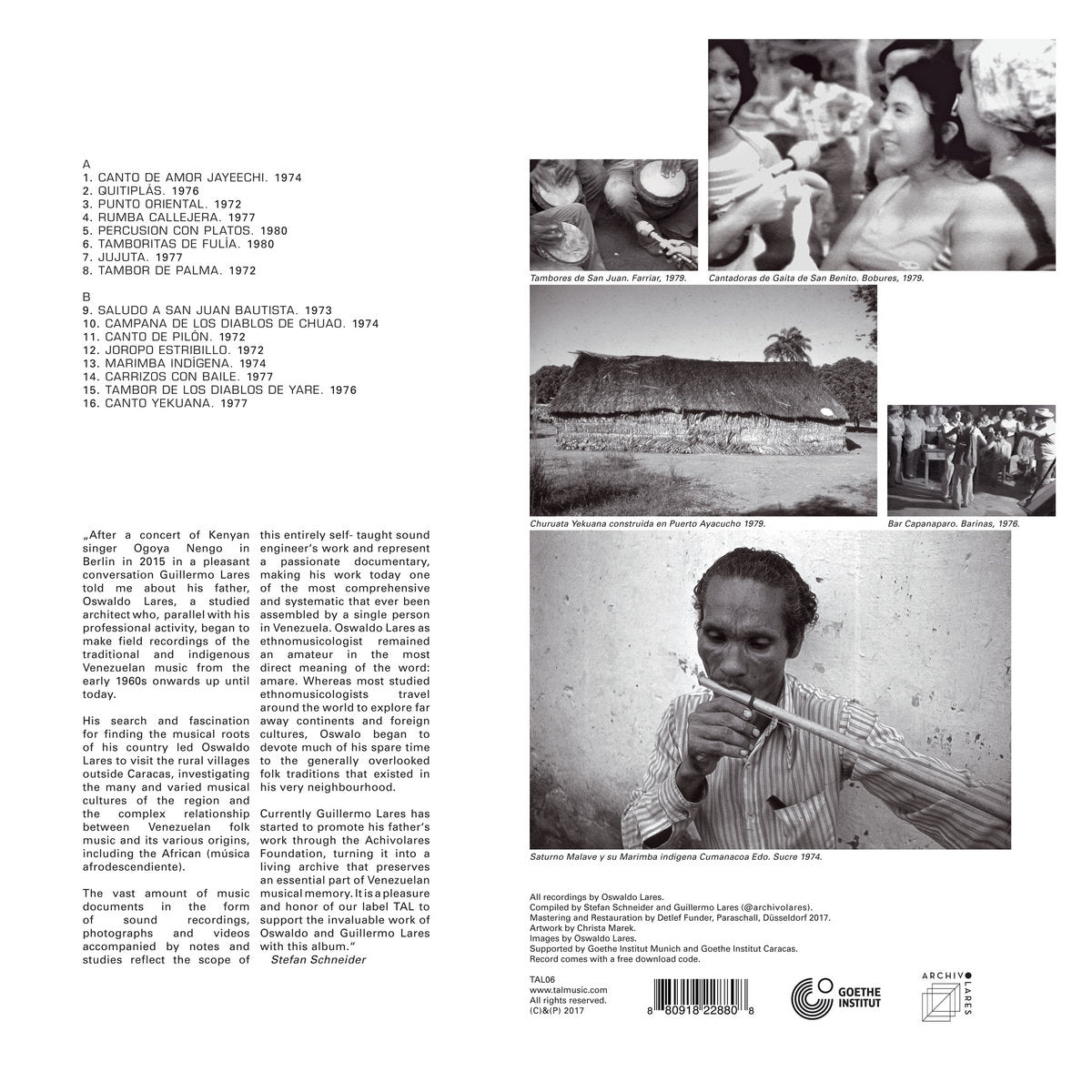Currently Guillermo Lares has started to promote his father‘s work through the Achivolares Foundation, turning it into a living archive that preserves an essential part of Venezuelan musical memory. It is a pleasure and honor of our label TAL to support the invaluable work of Oswaldo and Guillermo Lares with this album." - Stefan Schneider